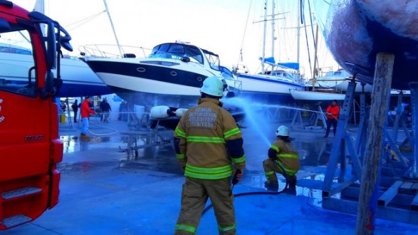 senaryo gereği yangın çıkan bir tekneye müdahale edildi. Senaryoya göre yangın çıkan tekneye