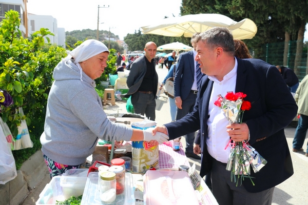 Çeşme Belediye Başkanı M. Ekrem Oran gösterinin ardından Çeşme Pazarı’nı gezerek kadınların 8 Mart Dünya Emekçi Kadınlar Günü’nü kutladı. Kadınlara tek tek karanfil dağıtan Başkan Oran;
