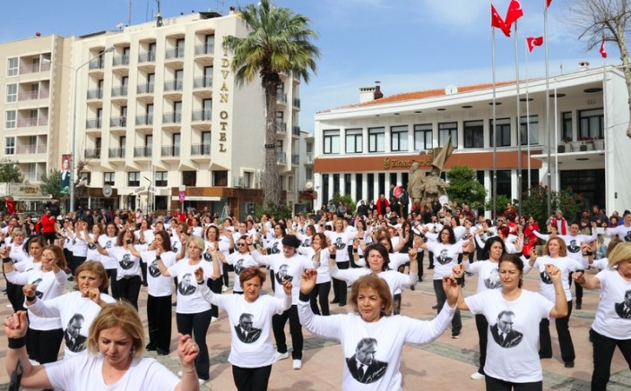 Etkinliğin son bölümünde Çeşme Belediyesi tarafından Sarı Zeybek Dans ve Sahne Sanatları Derneği destekleriyle sahne alan Çeşmeli kadınlar Atatürk tişörtleri giyerek coşkuyla zeybek oynadı. Vatandaşlar tarafından büyük alkış alan kadınlar gösteri sonunda mor balonları gökyüzüne uçurdu.