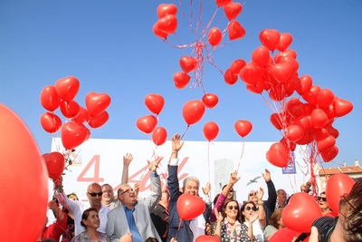 Kortej sonrası etkinlik alanına gelen Çeşme Belediye Başkanı Muhittin Dalgıç, kalp şeklindeki balonları gökyüzüne saldı.