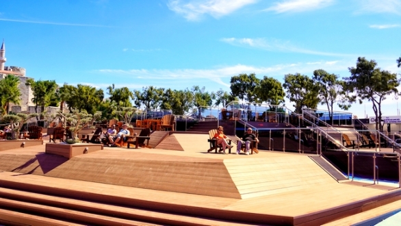 Toplam 1500 metrekare alanda, içerisinde 8 tane Anıt Zeytin Ağacı olan Güneşlenme Teraslarına ahşap koltuklar yerleştirildi. Kompozit deck kaplama yapılan alanda çevre ve peyzaj düzenlemeleri yapıldı. Güneşlenme Terasları ile Cumhuriyet Meydanı’ndan denize girilebilecek.