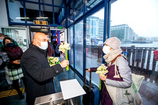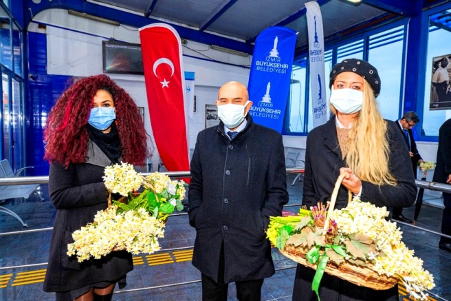 İzmir Büyükşehir Belediye Başkanı Tunç Soyer, tadilatı tamamlanarak yeniden hizmete giren Pasaport İskelesi'nin ilk yolcularını Karaburunlu üreticilerden alınan nergis çiçeği ile karşıladı.