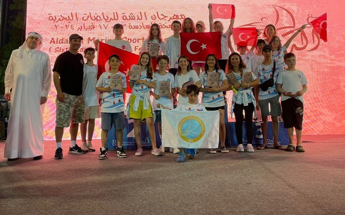 yelkenciler, madalyalarını almak üzere çıktıkları şampiyonluk kürsüsünde Türk bayrağı açtı.