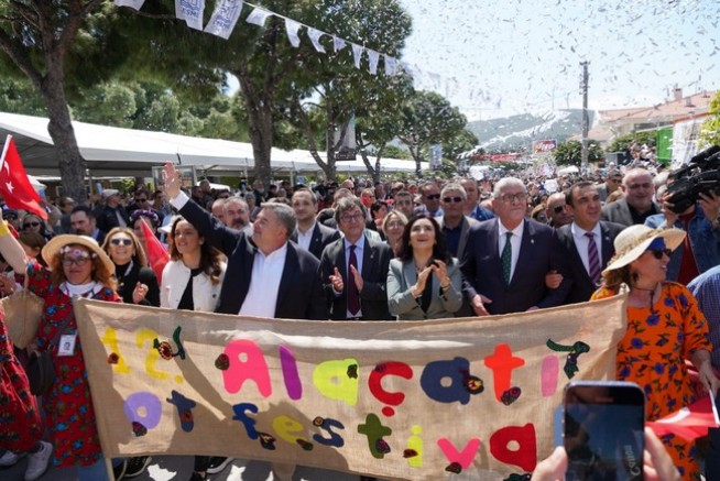 Çeşme Belediyesi tarafından bu yıl 12’incisi düzenlenen Alaçatı Ot Festivali’nin açılışı, Çamlık Yolu’ndan Alaçatı Çarşı’ya kadar yapılan kortejle başladı. Korteje Çeşme Belediye Başkanı M. Ekrem Oran’ın yanı sıra Cumhuriyet Halk Partisi Genel Başkan Yardımcısı Yüksel Taşkın, İyi Parti Grup Başkanvekili ve İzmir Milletvekili Musavat Dervişoğlu, CHP İzmir Milletvekili Sevda Erdan Kılıç, İzmir Milletvekilleri, siyasi parti temsilcileri, ilçe belediye başkanları, sivil toplum örgütü üyeleri, gastronomi uzmanları ve vatandaşlar şarkılar ve marşlar eşliğinde yürüdü.